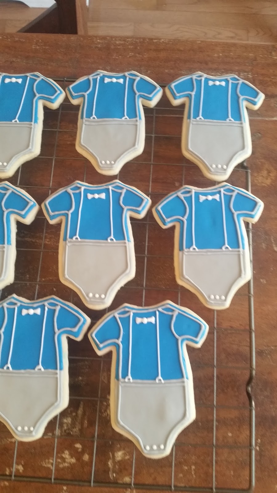 At the same time I was decorating the rose cookies, Carter's baby shower cookies were in the oven. I knew I wanted a blue, gray, and white color scheme for them, and spent some time planning out the designs.